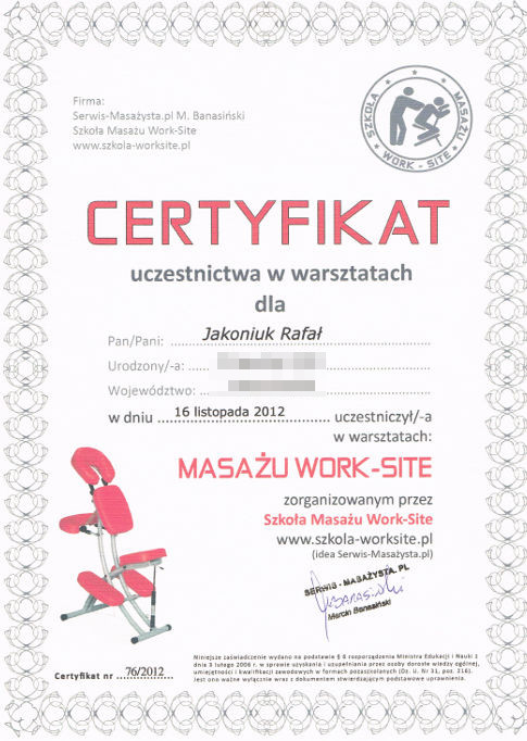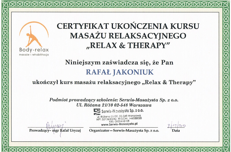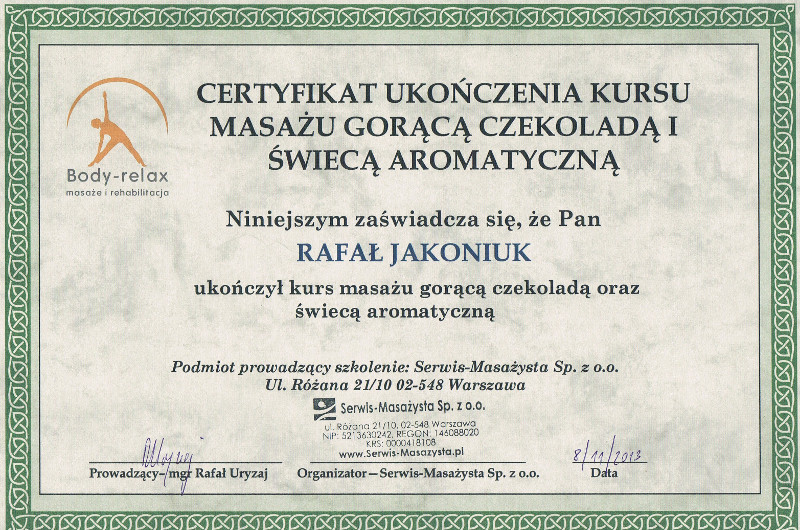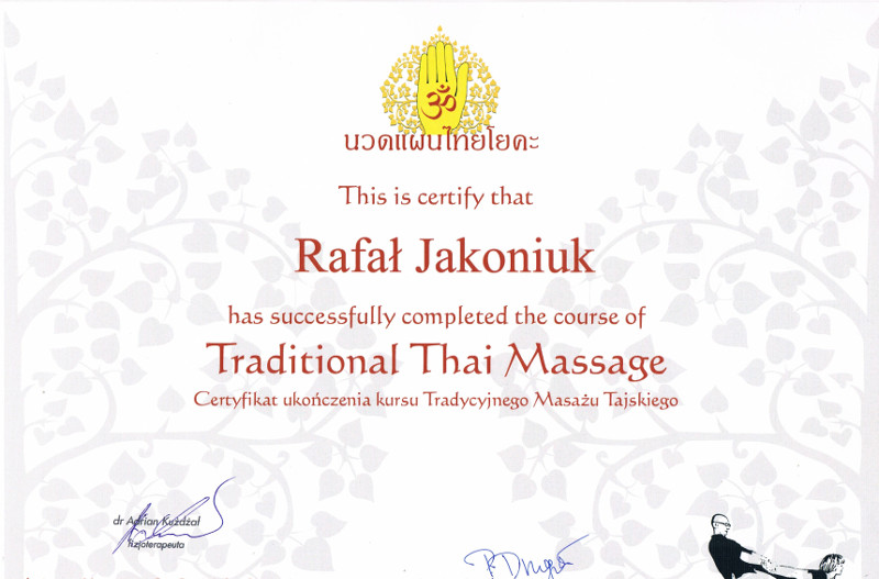Posiadany dyplom Technika Masażysty stanowi jedynie podstawę mojego wykształcenia z dziedziny masażu klasycznego. Uzyskałem dodatkowo certyfikaty kursów innych rodzajów masażu. Certyfikaty te potwierdzają moją wiedzę i kwalifikacje, a także gwarantują, że jestem przeszkolony w bezpiecznych i skutecznych technikach masażu. To daje klientom pewność, że otrzymają ode mnie wysokiej jakości usługi, które pomogą im w poprawieniu stanu zdrowia i osiągnięciu dobrego samopoczucia.