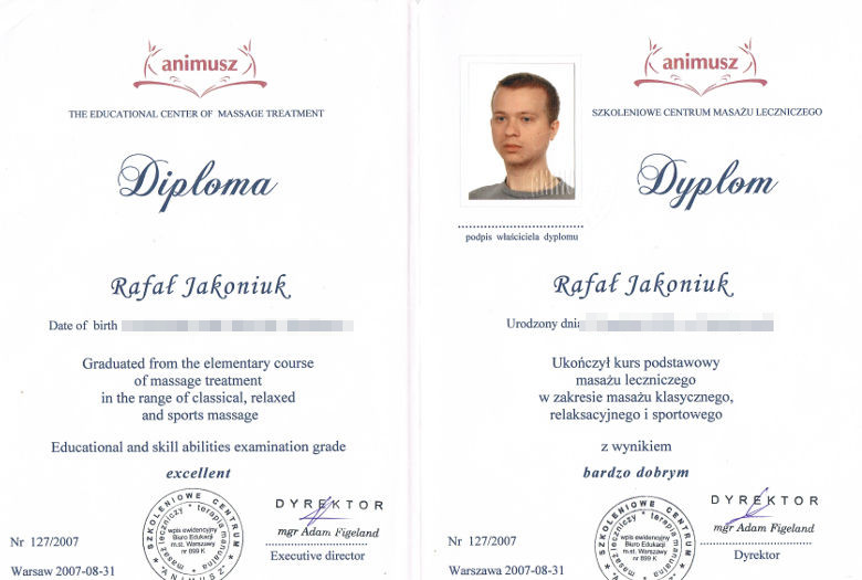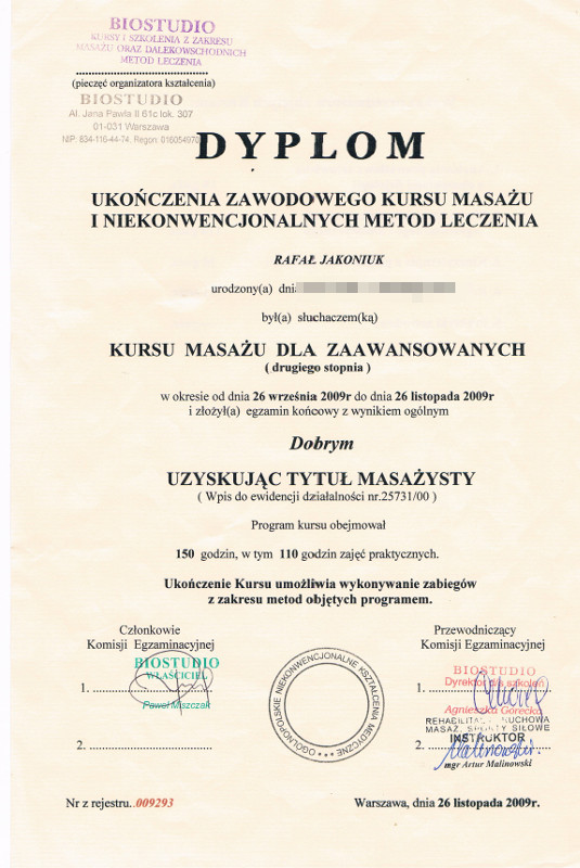 Jestem absolwentem studiów magisterskich na Wydziale Pedagogicznym Uniwersytetu Warszawskiego. Kwalifikacje i tytuł technika masażysty uzyskałem w Policealnym Studium Medycyny Sportu w Carolina Medical Center w Warszawie. Doświadczenie jako masażysta zdobywałem podczas sześcioletniej pracy zawodowej oraz wolontariackiej na przykład przy Maratonie Warszawskim.